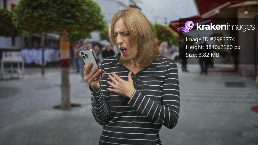 Woman holding smartphone with hand on chest and grimace while looking at screen on street; surprise concern.