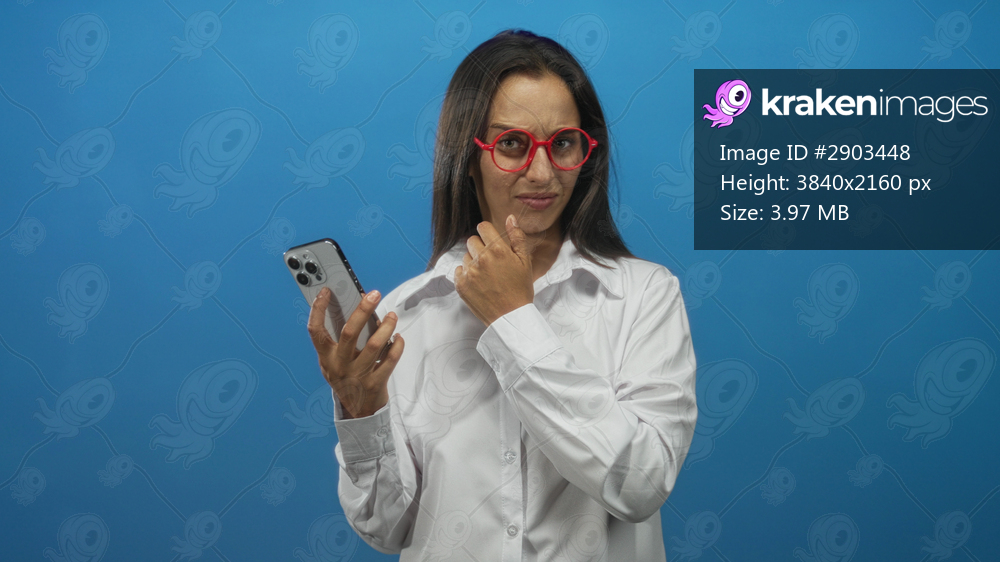 Woman holding smartphone with hand on chin showing pensive pose in blue studio, wearing red glasses and white shirt; confusion.