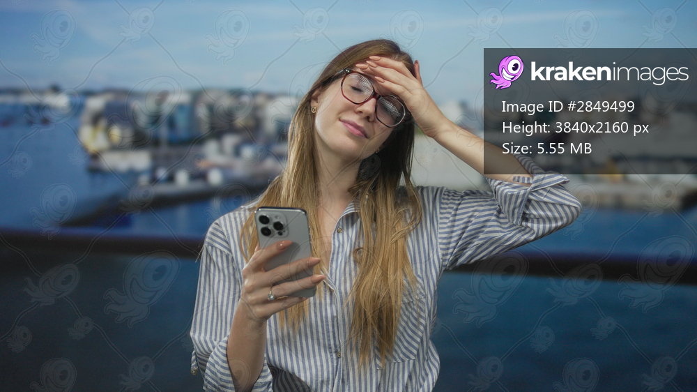 Woman holding smartphone with hand on forehead at port with blurred ferries behind her; exhaustion.