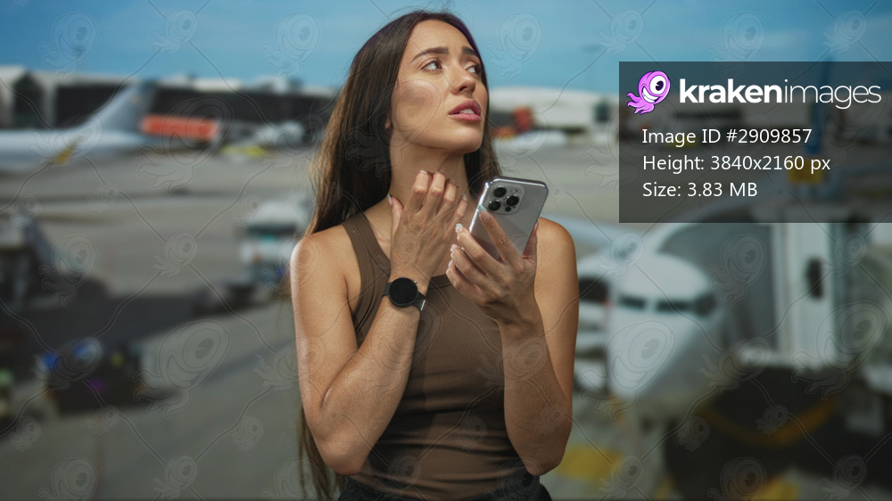 Woman holding smartphone, hand on neck while touching her throat and looking upward at airport gate; travel anxiety delay.