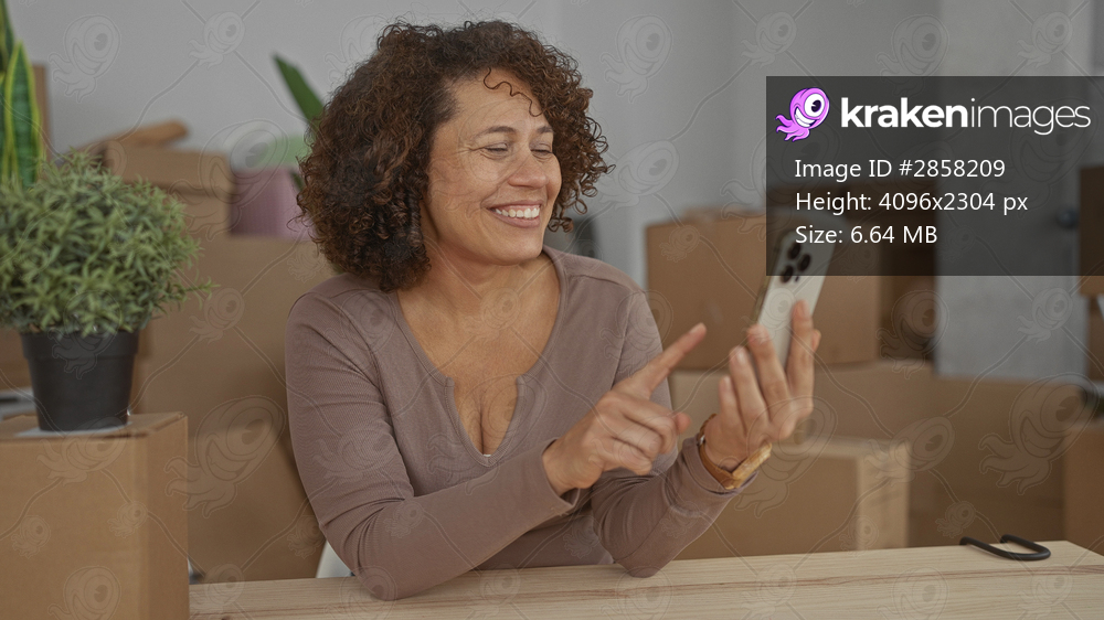 Woman holding smartphone and hand to cheek during video call in building surrounded by cardboard moving boxes and a potted plant; new home happiness.