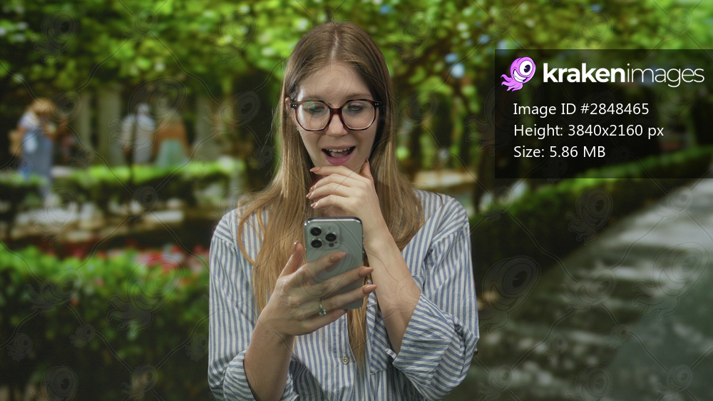 Woman holding smartphone with hand to mouth gesture in forest pathway lined with green hedges and trees; surprise curiosity.