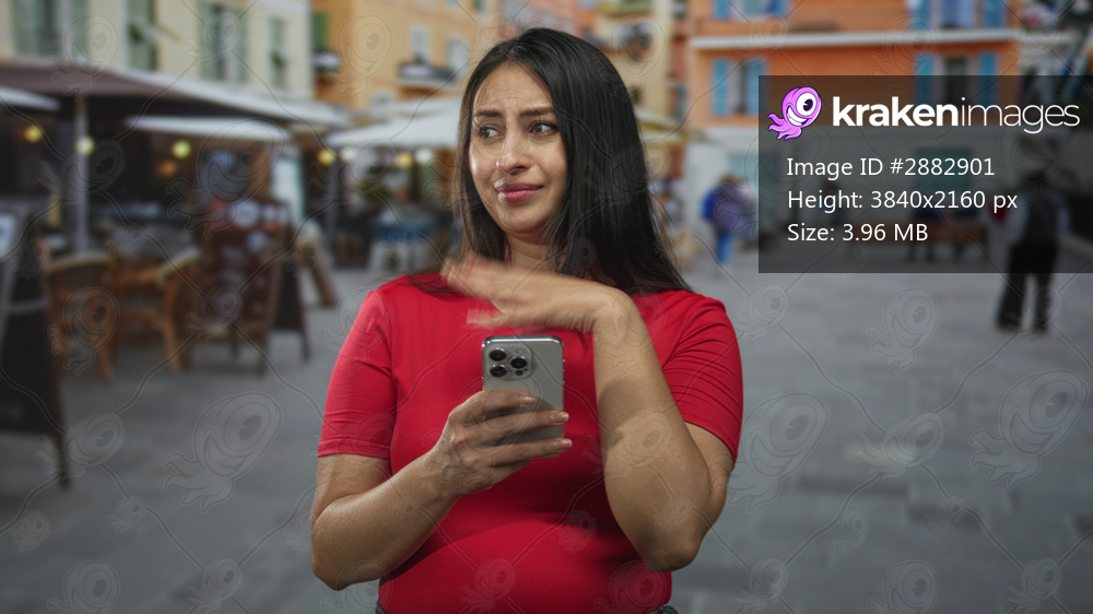 Woman holding smartphone with hand to nose on street terrace outside restaurant; privacy concern disgust.