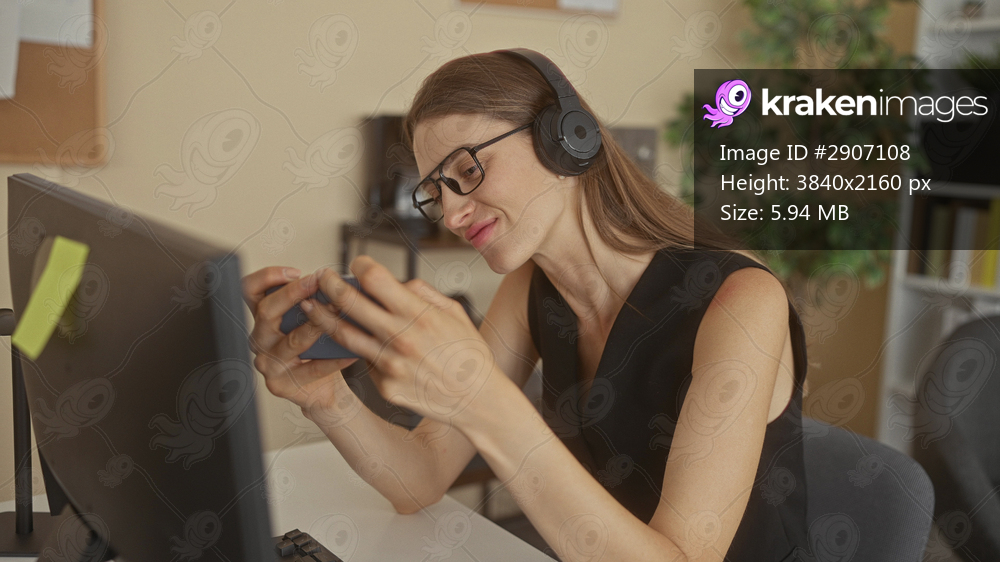 Woman holding smartphone with hands at office desk wearing headphones and glasses, smiling while looking down; concentration productivity.