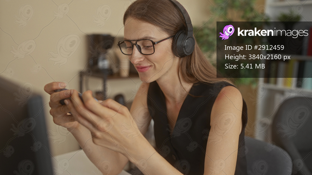Woman holding smartphone with hands at office desk wearing headphones and glasses, smiling while looking down; concentration productivity.