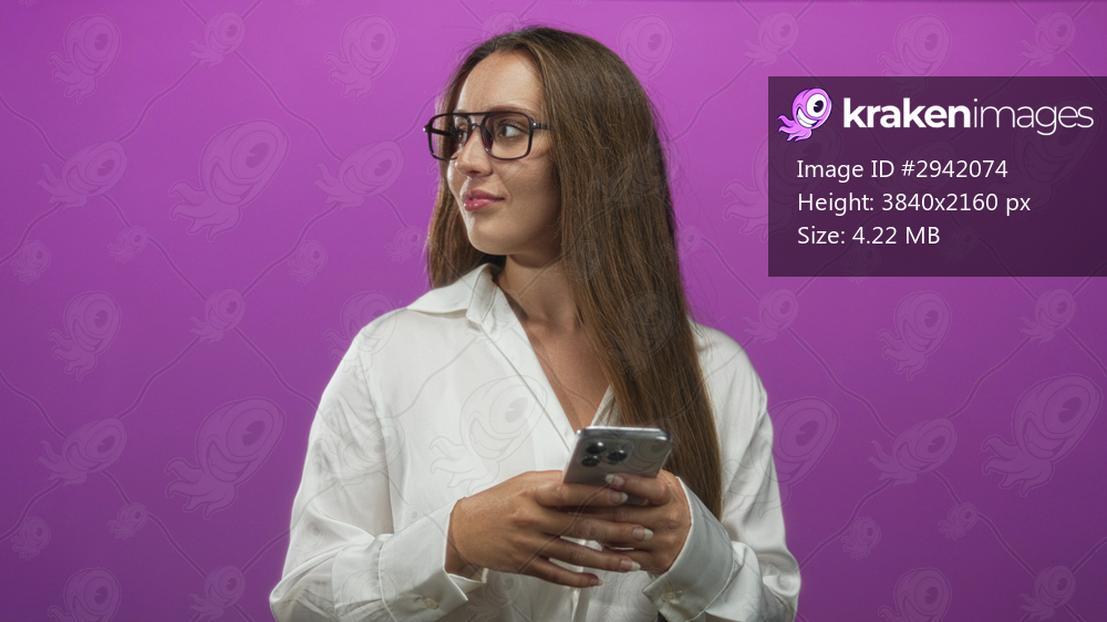 Woman holding smartphone with hands tapping screen in purple studio; quiet contemplation digital connection.
