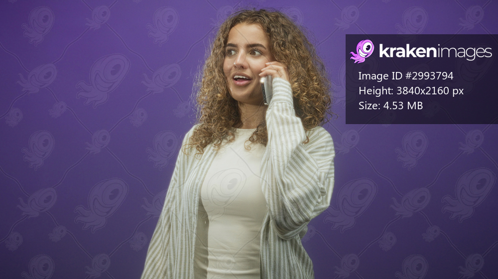 Woman holding smartphone with hands visible, smiling and checking screen in a purple studio; joyful connection.