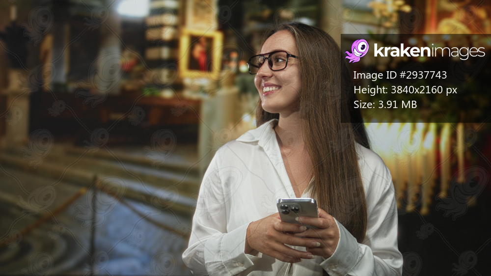 Woman holding smartphone, hands visible, smiling and looking to side in a church building; quiet reflection serenity.
