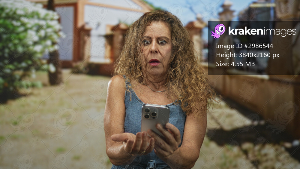 Woman holding smartphone in both hands, staring at screen with wide eyes, curly hair and blue tanktop visible on a street; surprise.