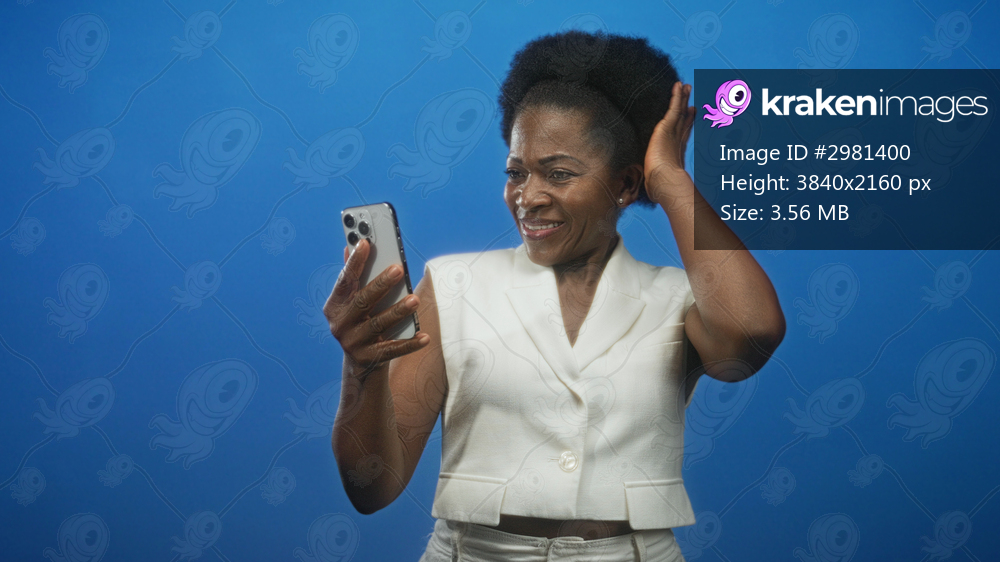 Woman holding smartphone in hand, smiling and touching hair while looking at screen in studio; joyful connection.
