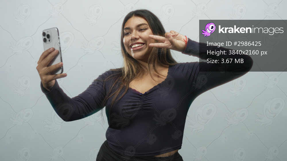 Woman holding smartphone in hand taking selfie and flashing peace sign in studio; playful confidence.