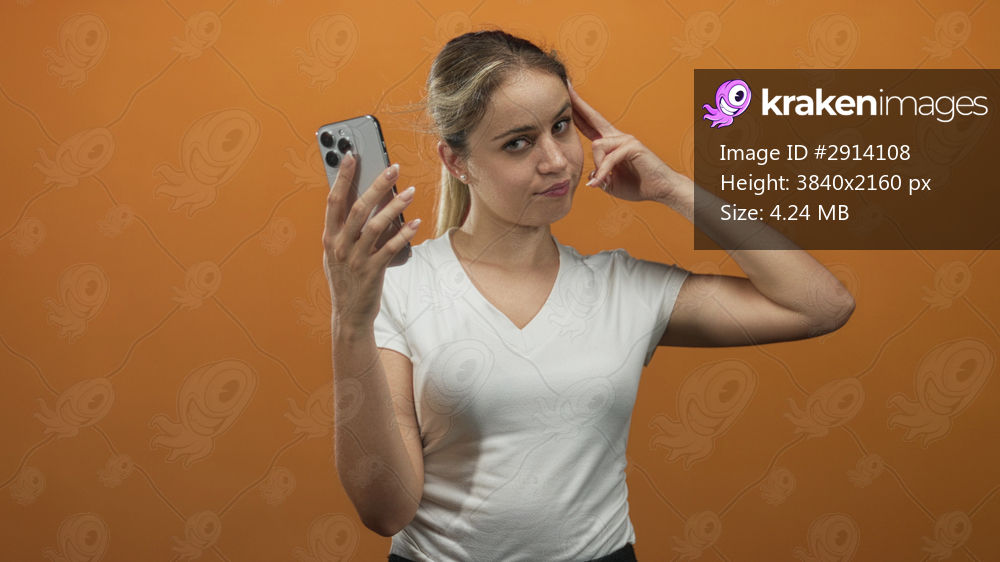 Woman holding smartphone in one hand and touching temple with finger while posing against an orange studio wall; thoughtful hesitation.