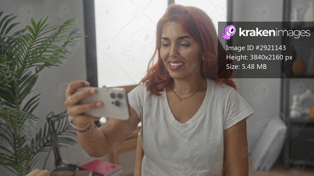 Woman holding smartphone in outstretched hand, smiling and pumping fist while seated at desk in studio room; joy connection.