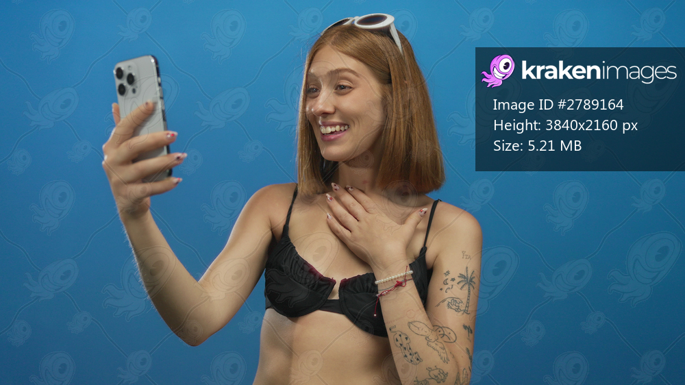 Woman holding smartphone in raised arm with wave gesture during a video call in a photo studio; connection happiness.