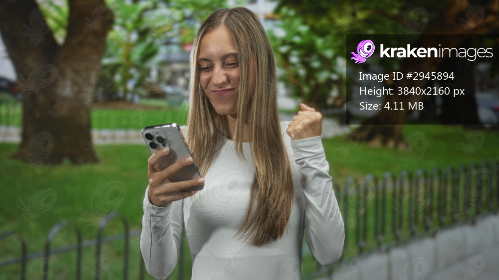 Woman holding smartphone laughs and pumps fist while looking at screen in a street park; joyful excitement and connection.