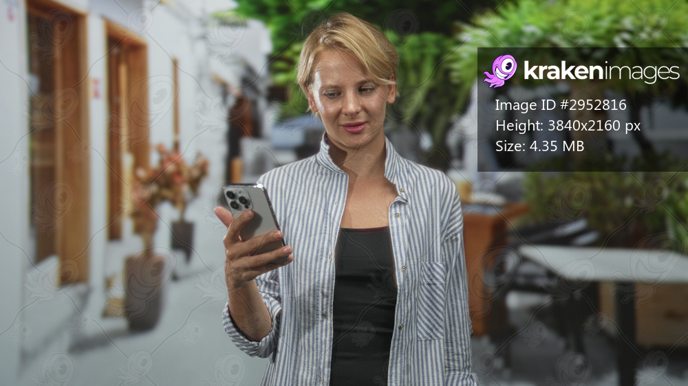 Woman holding smartphone and looking at the screen in a street cafe with tables, potted plants and a striped shirt visible; curiosity.
