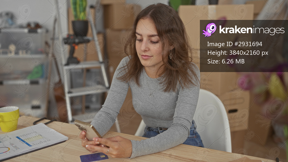 Woman holding smartphone and looking down, hands on phone above a creditcard on a table with moving boxes in a building; calm budgeting.