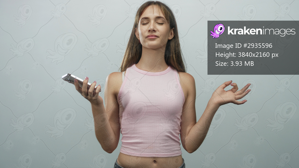 Woman holding smartphone and making meditation mudra in pale blue studio; calm mindfulness relaxation.