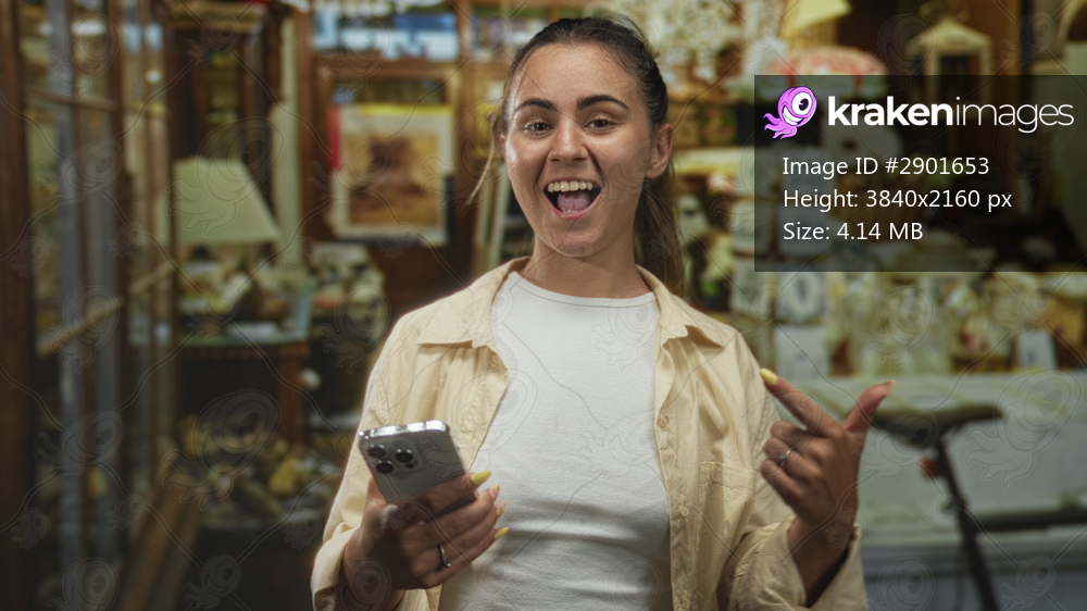 Woman holding smartphone and making ok sign with fingers in a boutique shop amid display shelves; approval.