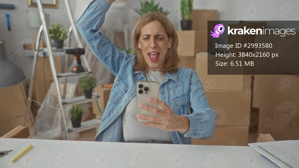 Woman holding smartphone with mouth open and arm raised among packed boxes in building; surprise relocation.