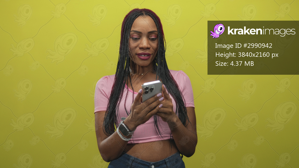 Woman holding smartphone with mouth open and hands on device, studio yellow backdrop; surprise discovery.