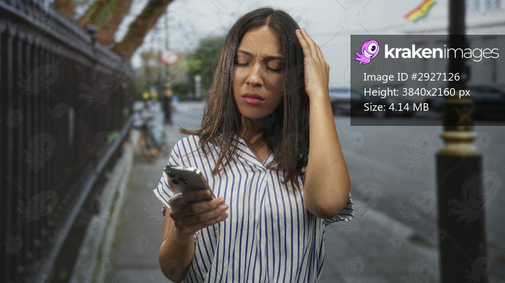 Woman holding smartphone on street, touching hair while reading a message; phone problem frustration.