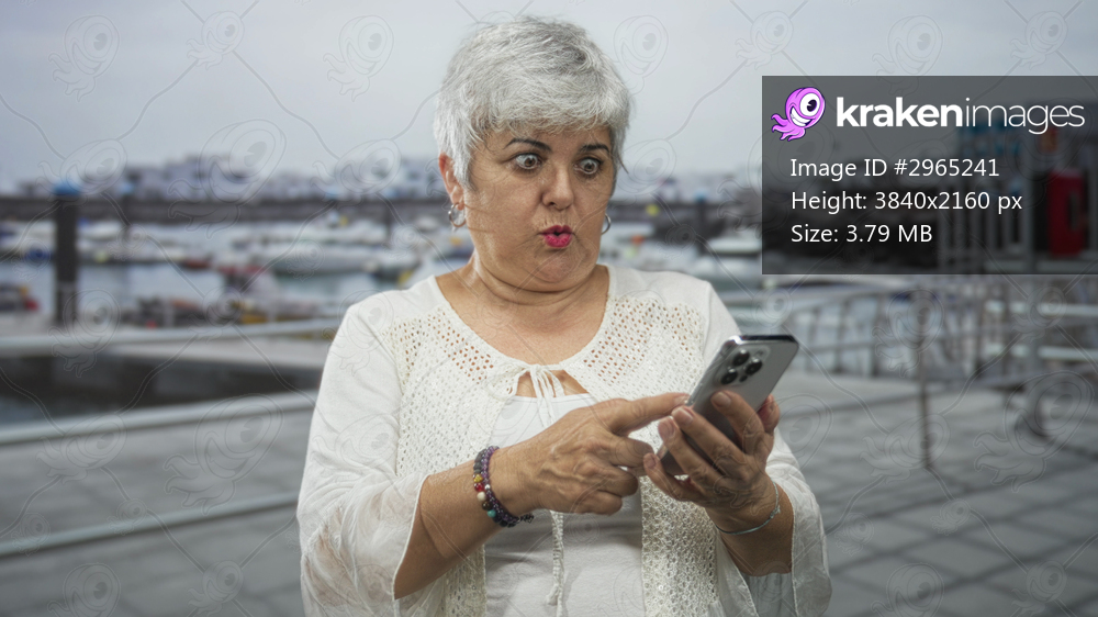 Woman holding smartphone and pointing finger at the screen while standing on a street pier by a marina, visible hands and bracelet; surprise concern.