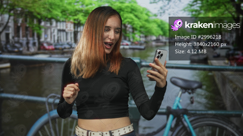 Woman holding smartphone and pointing finger to phone while smiling and glancing down at screen on street in front of canal and bicycle; joy connection. - Kraken Images