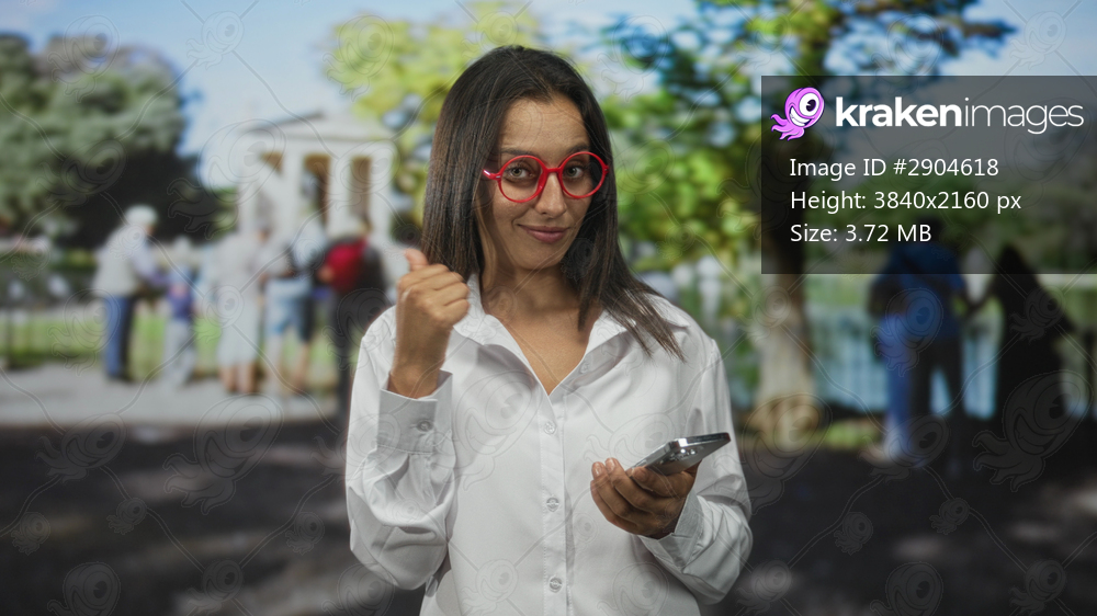Woman holding smartphone and pointing thumb at camera in forest setting while wearing red glasses and white shirt; confidence connection ease.