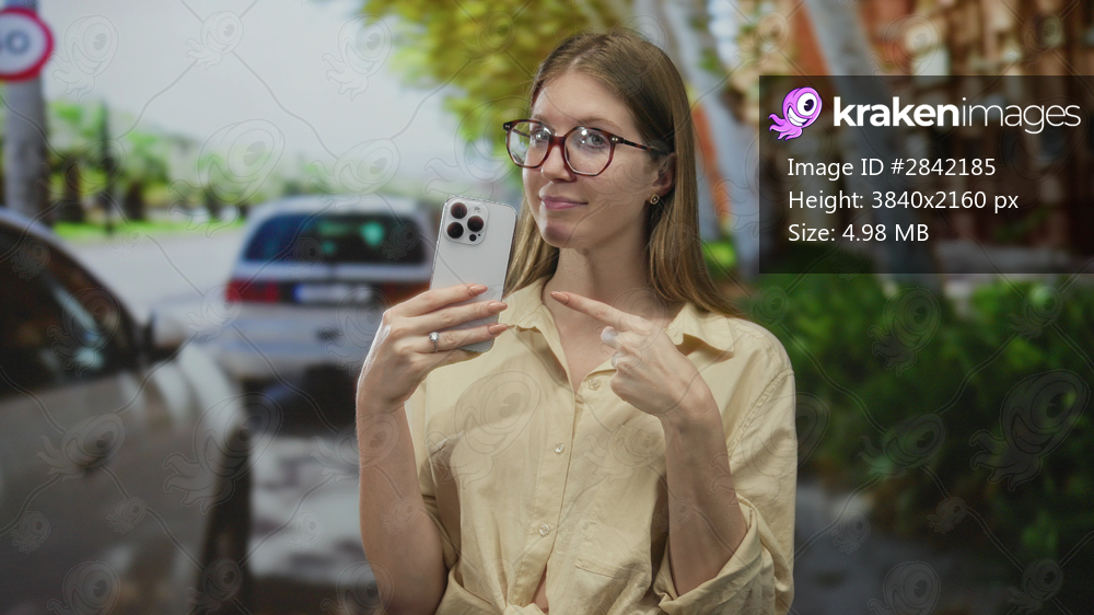 Woman holding smartphone points finger to phone screen on sunlit city street in front of building; confidence.