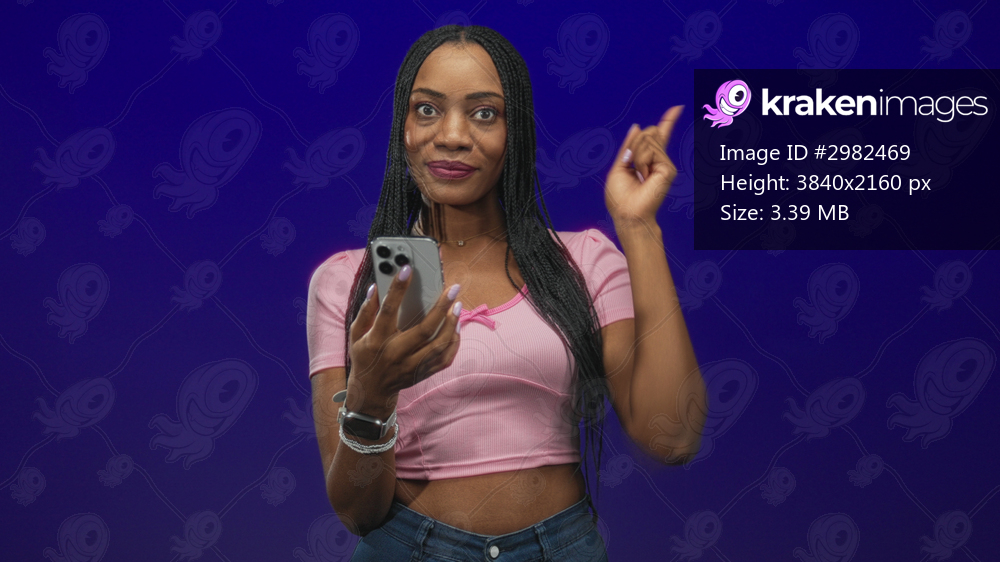 Woman holding smartphone, points finger upward in studio, wearing pink crop top and jeans while smiling and checking the screen; confidence celebration. - Kraken Images