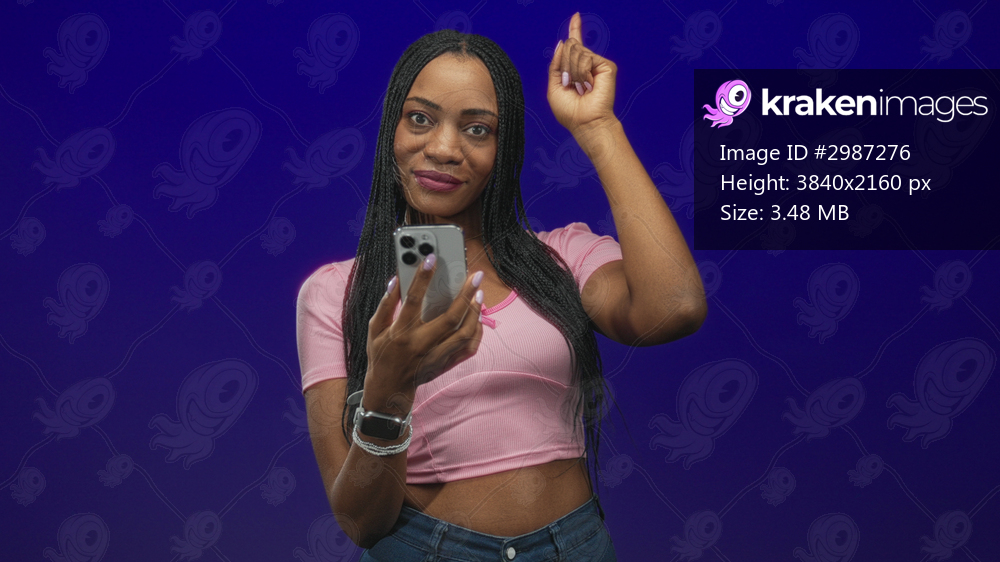 Woman holding smartphone, points finger upward in studio, wearing pink crop top and jeans while smiling and checking the screen; confidence celebration. - Kraken Images