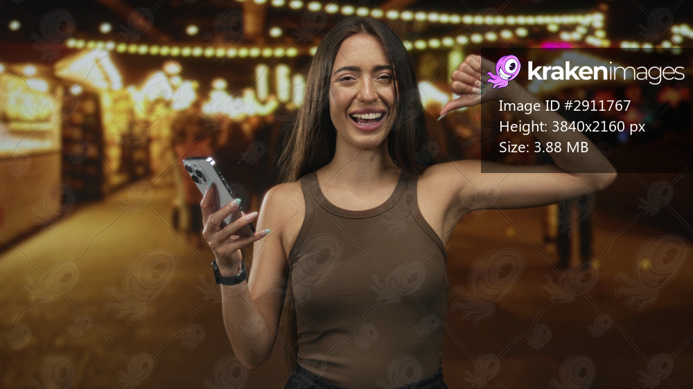 Woman holding smartphone points thumb to chest on street fair with string lights and blurred stalls; playful confidence.