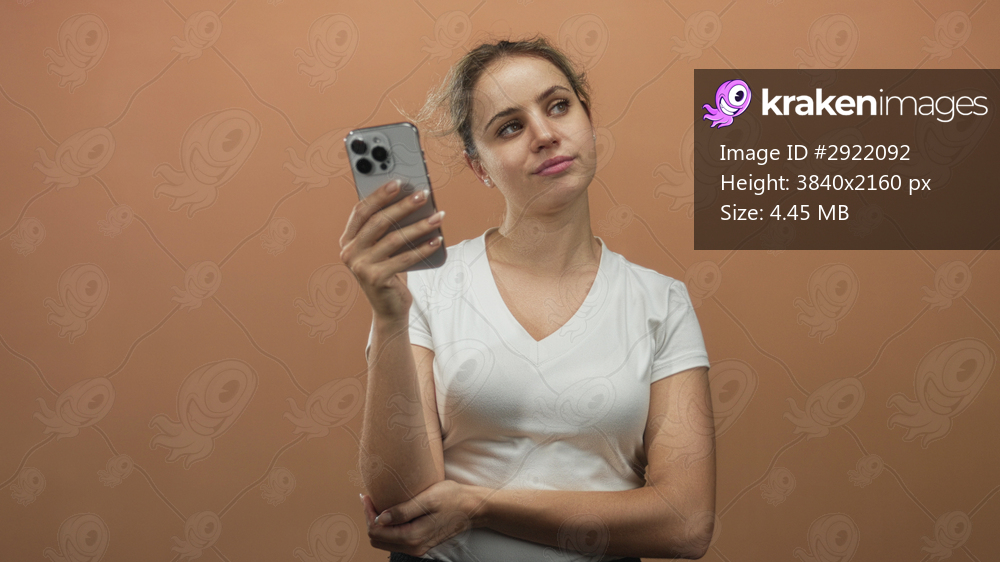 Woman holding smartphone with raised hand and crossed arm in studio with tan wall; contemplation insight.