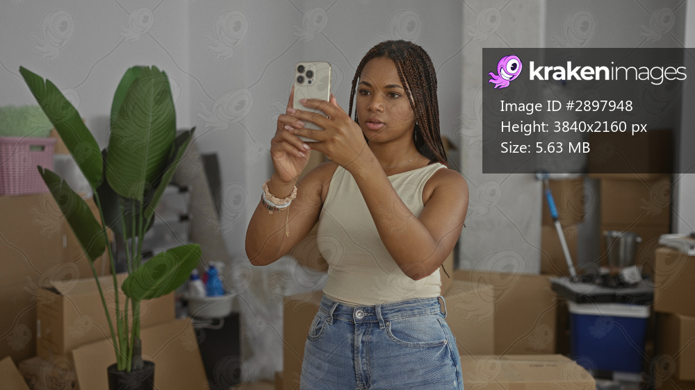 Woman holding smartphone with raised hands amid cardboard boxes and plant in building during unpacking; anticipation.