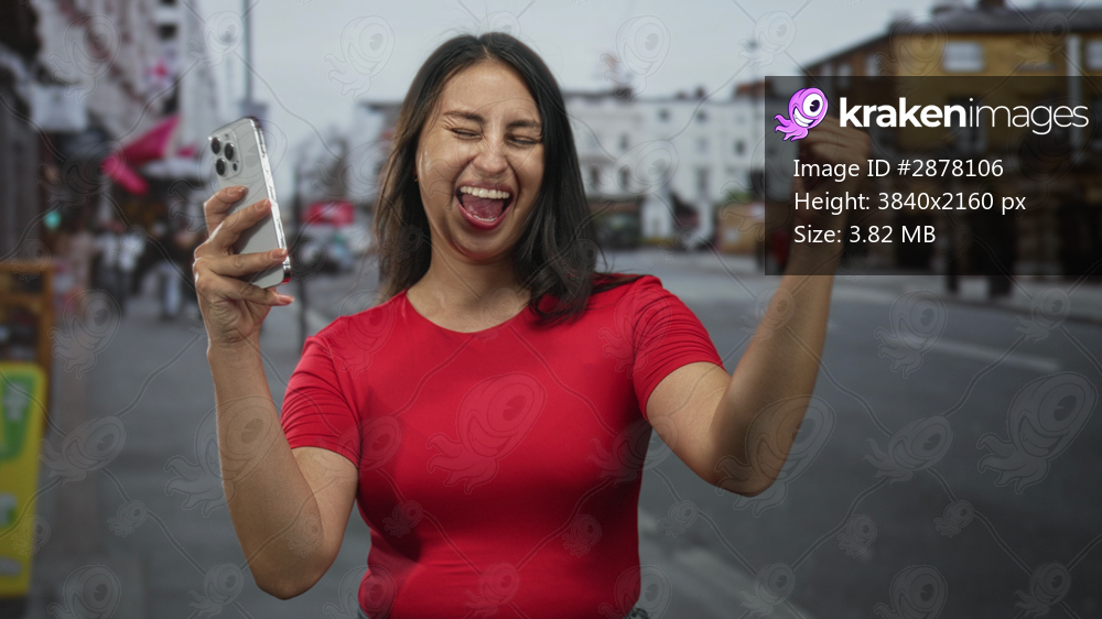 Woman holding smartphone and raising fist on street sidewalk wearing red top; celebration success triumph urban.