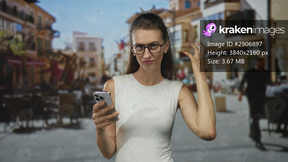 Woman holding smartphone and raising hand in a street cafe terrace while frowning at screen; digital frustration.