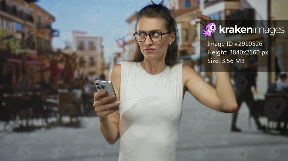 Woman holding smartphone and raising hand in a street cafe terrace while frowning at screen; digital frustration.
