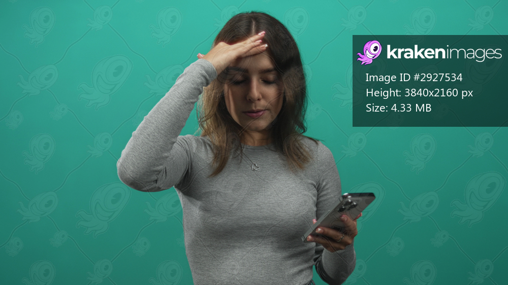Woman holding smartphone and raising hand to forehead, furrowed brow in studio teal background; worry distraction.