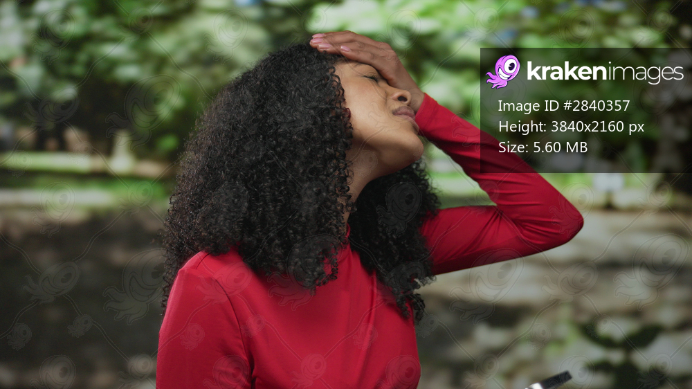Woman holding smartphone reading message with hand on forehead amid green park trees and pathway; stress.