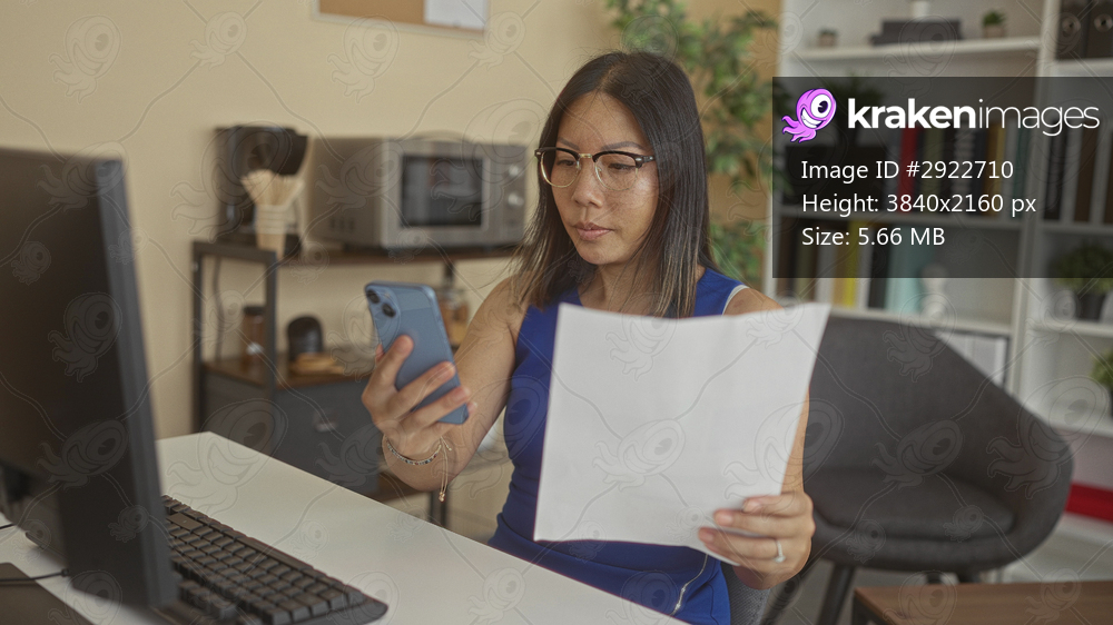 Woman holding smartphone and reading printed document at office desk with shelves and computer monitor visible; quiet concentration.