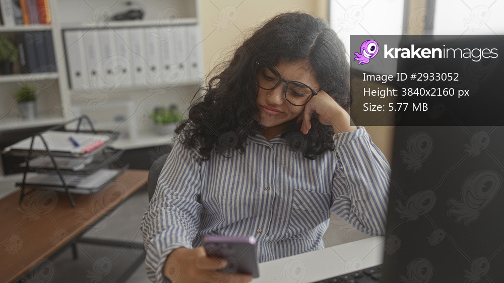 Woman holding smartphone and resting head on hand at office desk, wearing glasses and striped shirt; boredom distraction.