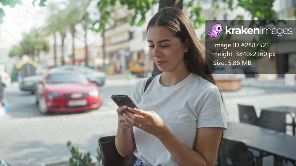 Woman holding smartphone and scrolling at a sidewalk cafe on a busy street during daylight; urban calm.