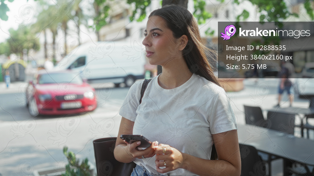 Woman holding smartphone and scrolling at a sidewalk cafe on a busy street during daylight; urban calm.