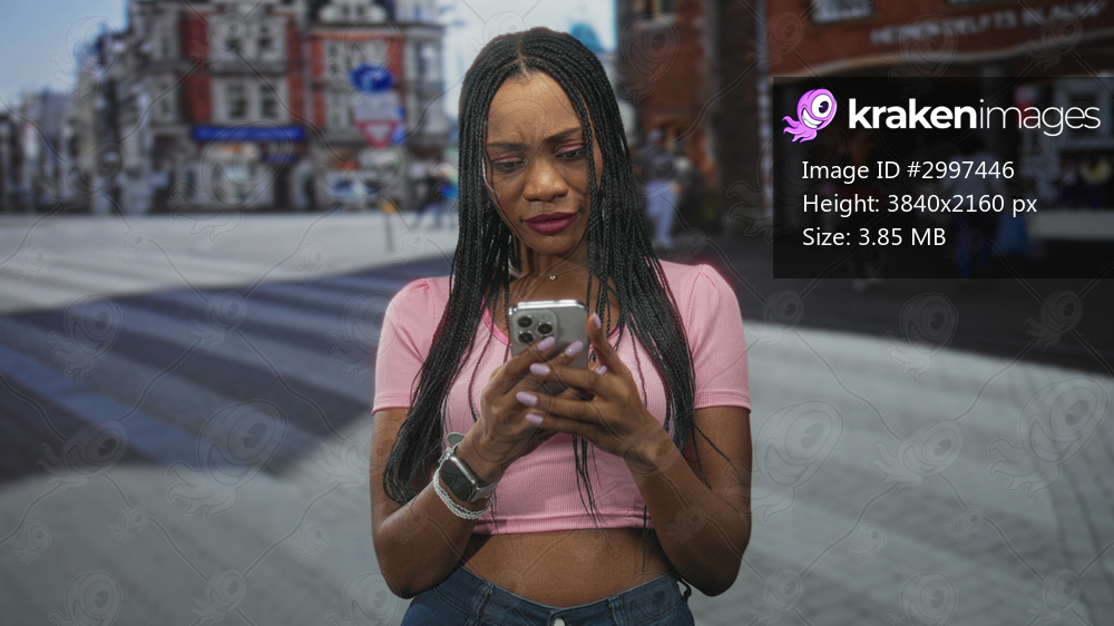 Woman holding smartphone and scrolling with both hands on a street with midriff exposed; quiet focus.