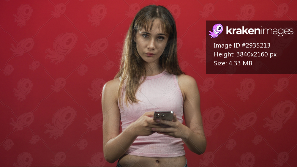 Woman holding smartphone and scrolling while looking down in red studio, wearing pink crop top and showing navel; quiet boredom.