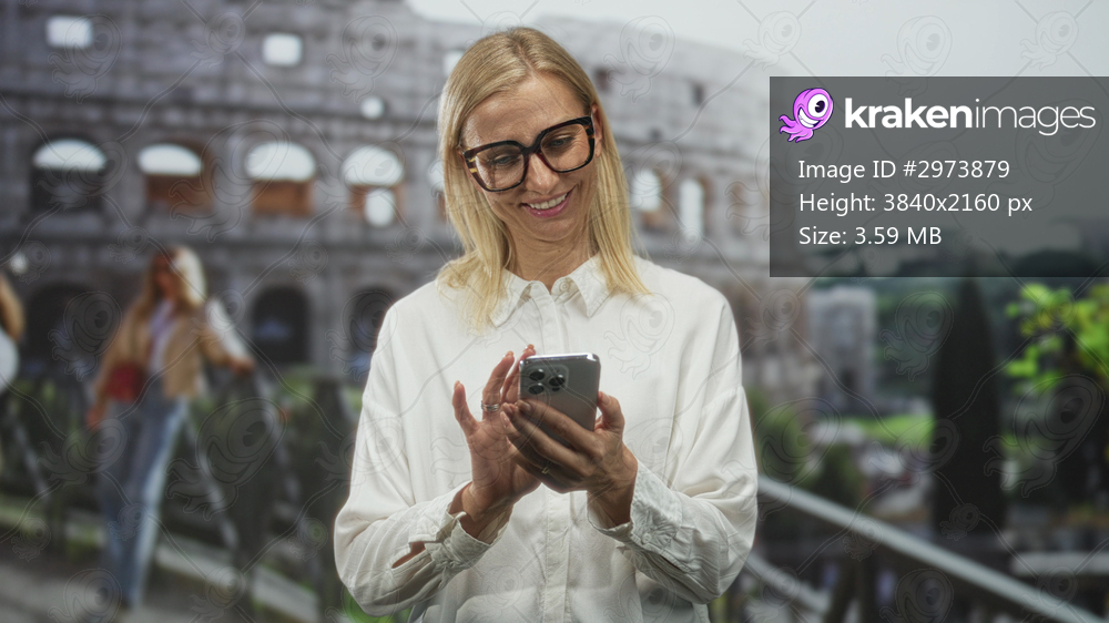 Woman holding smartphone, smiling at screen while standing by railing in a historic building near the colosseum tourist site; contentment memories.