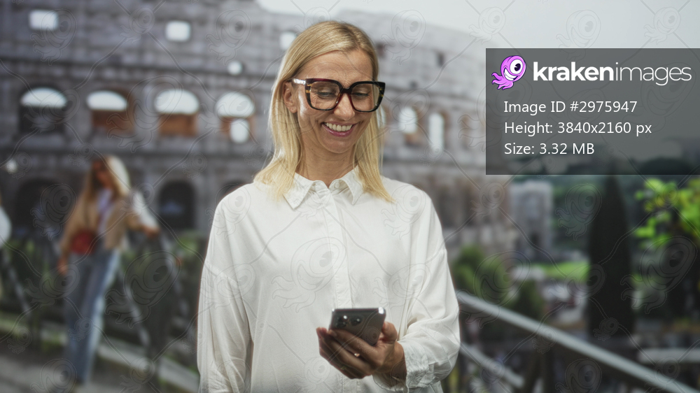 Woman holding smartphone, smiling at screen while standing by railing in a historic building near the colosseum tourist site; contentment memories.