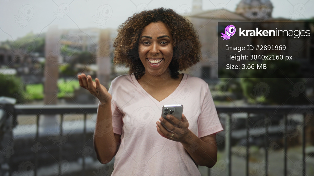 Woman holding smartphone, smiling and gesturing with open hand at building ruins balcony in rome; joy travel discovery.