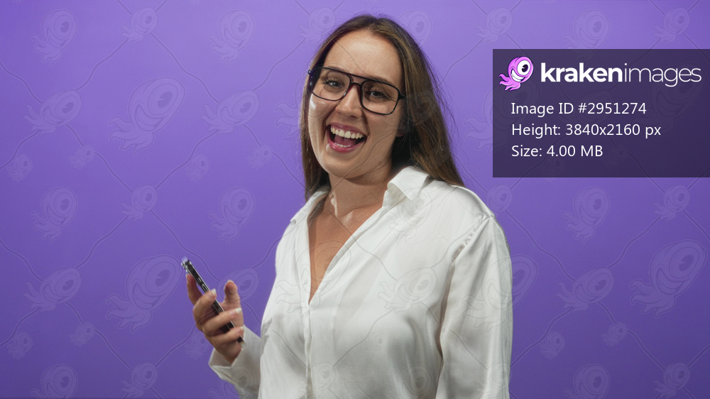 Woman holding smartphone and smiling in studio against purple backdrop while wearing glasses and white shirt; happiness confidence connection.